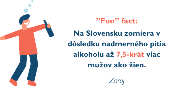 A teraz sa nebudeme zapodievať len smrťou, ale aj inými štatistikami. Bohužiaľ, na Slovensku veľmi silne holdujeme aj alkoholu. Podľa posledných výskumov OECD muž vypije v priemere 17,4 l čistého alkoholu ročne, zatiaľ čo u žien je to 5,3 l.