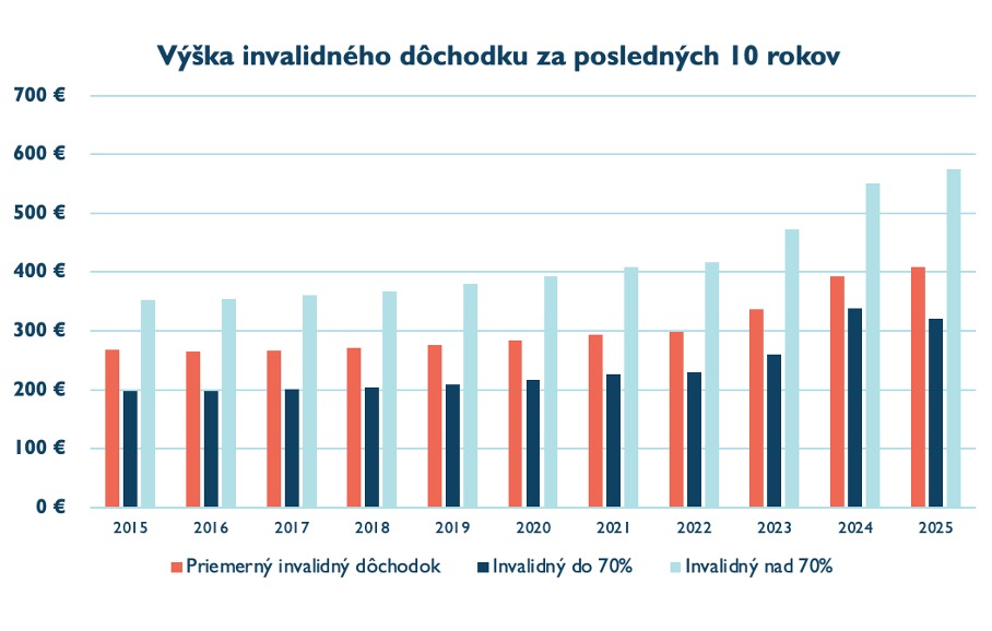 Problém nastáva, ak má muž poistenú invaliditu len na úver. Priemerná výška invalidného dôchodku je za rok 2025 neuveriteľných 408€ ako uvádzame v grafe. Čiže v prípade invalidity a takého nastavenia poistky splatíš úver, no na všetky ďalšie výdavky ti ostane mesačne 408€ ak už nebudeš môcť pracovať.