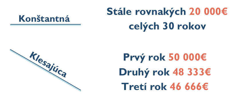 👉 Klesajúca: napr. 50 000€ na 30 rokov – každý rok sa ti táto suma znižuje o 1/30.